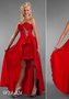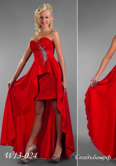 Королевское вечернее платье яркого красного цвета создано для самых дерзких модниц. Короткое платьице с открытой зоной декольте и юбочкой до середины колена дополнено верхней юбкой – шлейфом. Наряд выгодно подчёркивает бюст и пикантно приоткрывает прекрасные ножки своей обладательницы. Сверкающая вставка на груди приковывает к себе все взгляды.