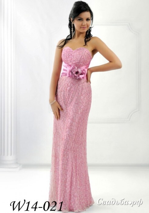 Роскошное платье с лифом в форме сердечка и крупной розой на талии выгодно подчёркивает все женственные изгибы фигуры. Оригинальная фактура наряда достигается благодаря тончайшей вышивке ручной работы. Платье переливается в лучах света. Этот наряд с длинной юбкой прямого покроя зрительно вытягивает силуэт. Свежая и изысканная модель.