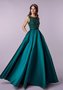 Эффектное вечернее платье А-силуэта, линия декольте "лодочка". Спинка застегивается на молнию. Корсетная часть платья расшита бисером, юбка с карманами выполнена из атласа микадо.