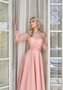 Стильное вечернее платье А-силуэта с длинными рукавами. Прозрачная кокетка из сеточки открывает линию декольте. Платье выполнено из восковой органзы нежно розового цвета с матовым блеском.