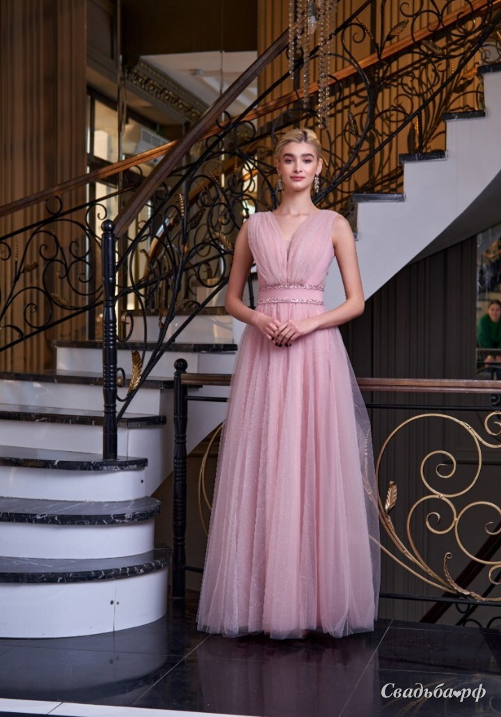 Стильное вечернее платье A-силуэта, на бретелях с V-образным вырезом по линии декольте и спинке. Наряд выполнен из английского фатина. Линия талии подчеркнута поясом, украшенным бисером